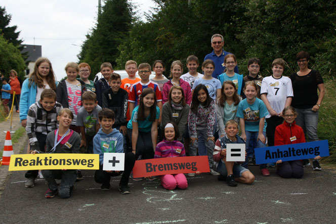 Nachdem die Kinder zuerst bei vollem Lauf an einer vorgegebenen Stelle anhalten müssen, folgt die Aufgabe auf ein Zeichen hin anzuhalten. So merken die Kleinen schnell was ein Reaktionsweg bedeutet. Die Formel Reaktionsweg + Bremsweg = Anhalteweg ist für die Kinder schnell ein Begriff. Vor allem wenn diese Aufgaben auf dem Fahrrad oder sogar mit Einsatz eines Autos dargestellt werden, sind alle Schüler über den langen Anhalteweg überrascht.
